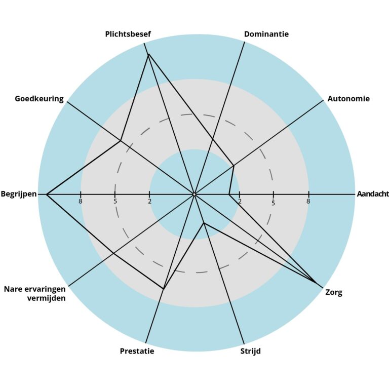 Door middel van een online in te vullen vragenlijst, ontstaat een profiel. Dit ‘spinnenweb’, toont de sterkte van je drijfveren en je denkstijlen ten opzichte van anderen.
